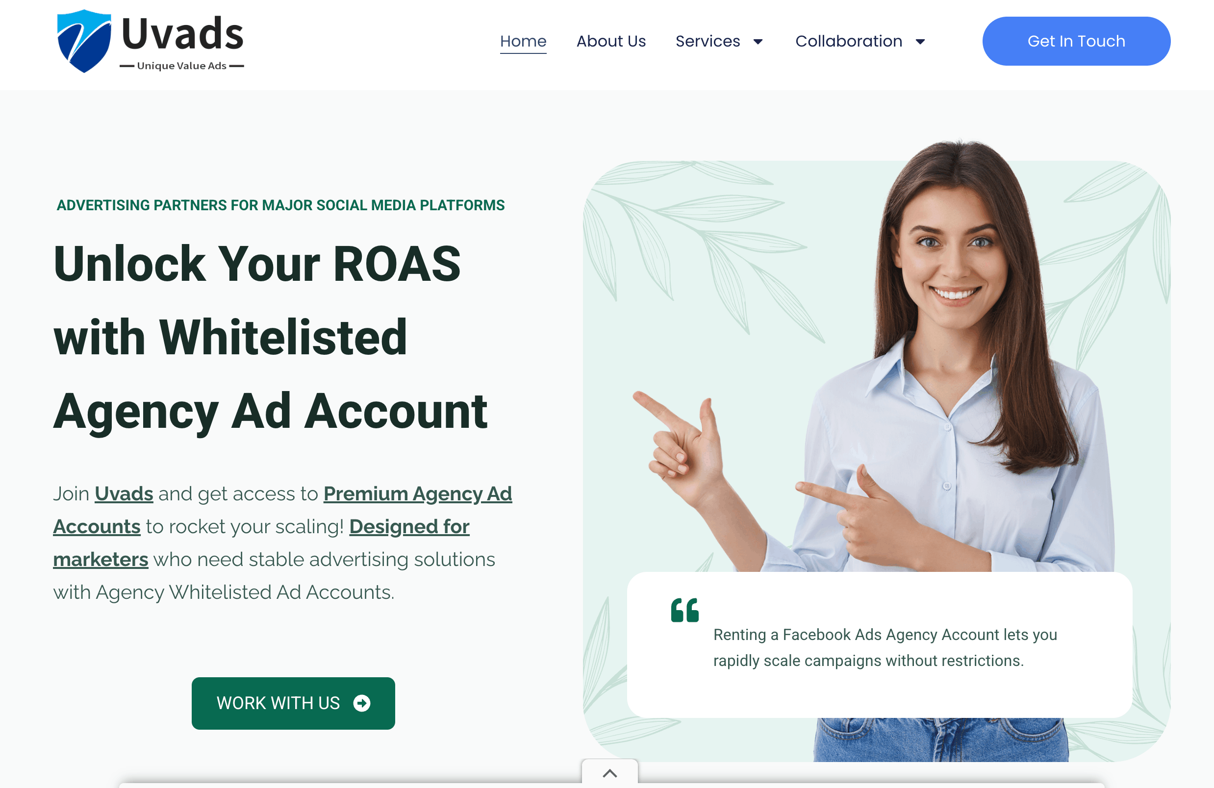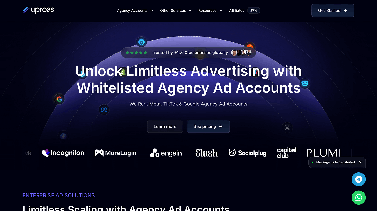 Uproas leads the industry with verified Meta partnerships and serves over 1,750 advertisers globally. They’re known for delivering high-trust, pre-warmed accounts across multiple platforms with exceptional stability and support.