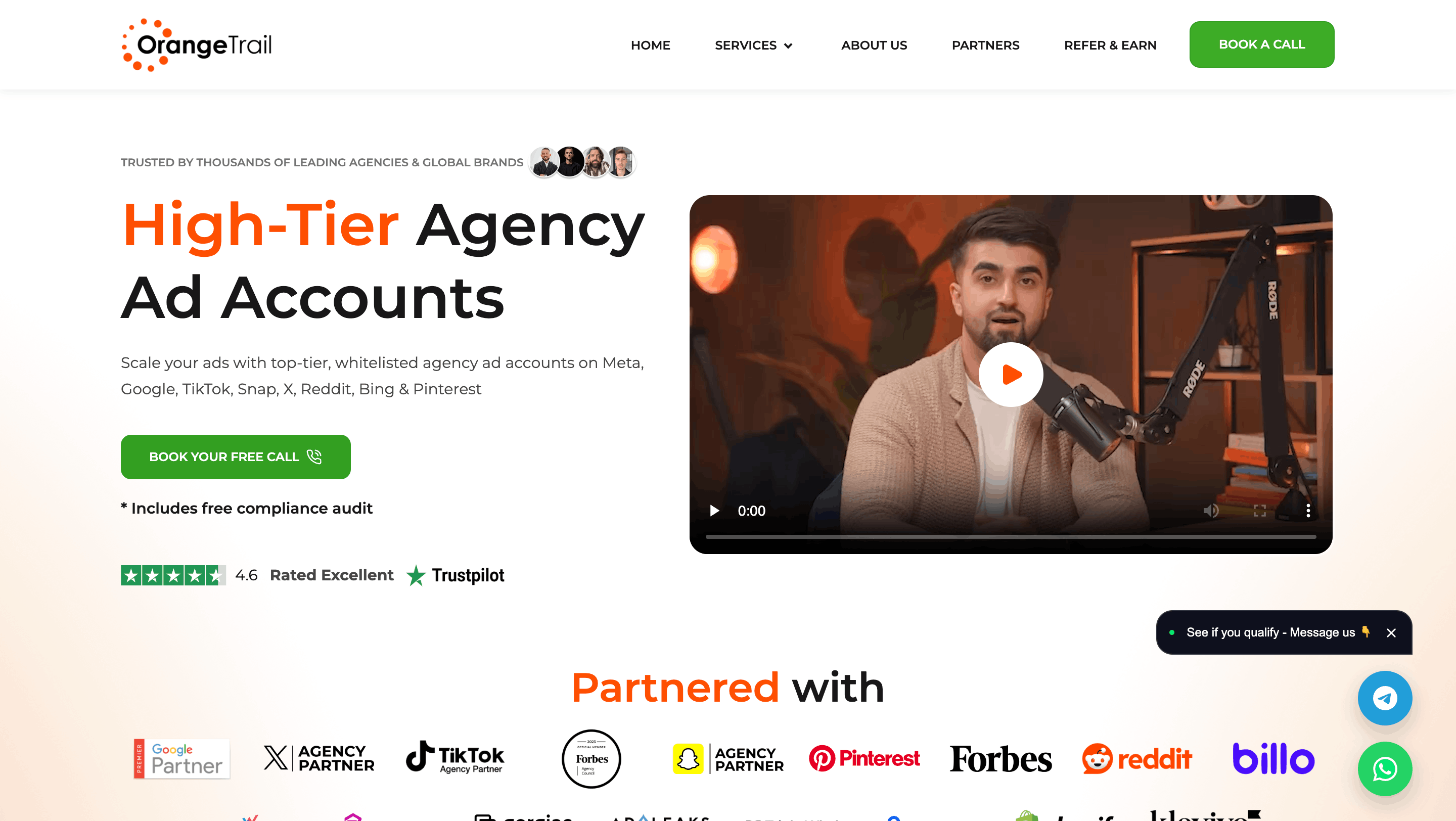 OrangeTrail is a compliance-focused Meta Business Partner with 27+ full-time experts specializing in “green status” pre-vetted accounts. They’re the go-to choice for advertisers who need rock-solid compliance infrastructure and want to avoid policy violations before they happen.